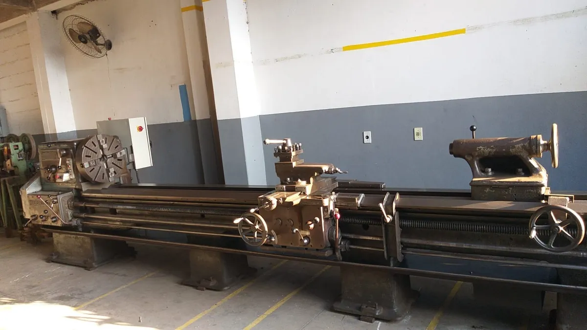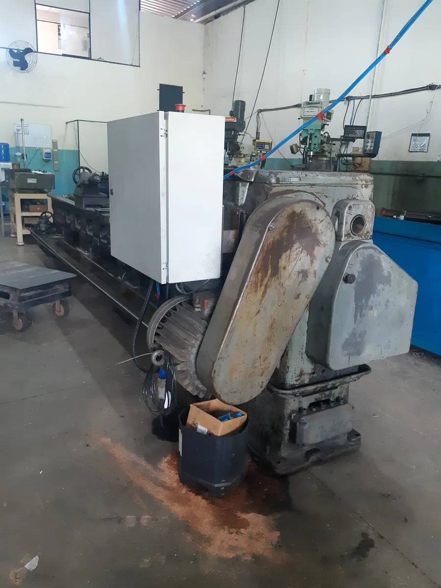 Torno Mecânico Horizontal, Com 4000mm entre pontos, Com Passagem de 450mm em cima no carro transversal, Com passagem de 650mm em cima do barramento, Com passagem de 870mm na caça, Com passagem de 70mm de diâmetro no eixo árvore, Com placa de 3 castanhas, Com duas placas de quatro castanhas, Com largura do barramento de 460mm, Com Manual original da máquina, Equipamento todo original de fábrica usado em excelente estado de conservação. OBS IMPORTANTE: Por conta das características deste produto não poderá ser postado nos correios e nem pontos drops pelo fato de suas dimensões e peso não atenderem este enquadramento logístico, de modo que caso optem pela compra favor escolher retirar nas mãos do fornecedor evitando assim que a venda seja descontinuada.